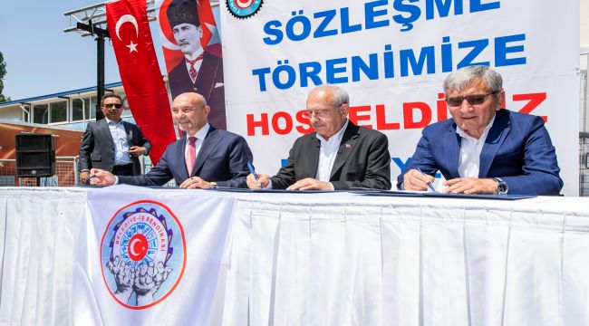 Celal Atik Spor Salonu’nun bahçesinde düzenlenen imza törenine CHP Genel Başkanı ve İzmir Milletvekili Kemal Kılıçdaroğlu, İzmir Büyükşehir Belediye Başkanı Tunç Soyer, Belediye İş Sendikası Başkanı Nihat Yurdakul katıldı. İşçilerin alın terine, emeklerine sonsuz saygı duyduğunu söyleyen CHP Genel Başkanı Kemal Kılıçdaroğlu, “100 binin üzerinde taşeron işçisi vardı ve hiç birisinin doğru düzgün sosyal güvencesi yoktu. Hiç birisinin doğru dürüst gelecek güvencesi yoktu. Erzurum’dan başlayarak örgütledik işçileri. Önce dernekler kurduk. Sokak sokak mücadelesini verdik. Ve yüz binlerce kişiye kadro vermek zorunda kaldılar. Şu an da yine on binlerce taşeron işçisi var. Hakkı hukuku savunmak zorundayız. Örgütlü olduğunuz için güçlüsünüz. Bölünüp ayrışırsanız hakkınız aranmaz bu tuzağa düşmeyin. Yüz binler açlık sınırının altında gelir alıyor. TÜİK’in önüne giderken sadece işçinin hakkını değil dul ve yetimlerin, memurun, emeklinin hakkını savunmaya gittim. Sorunu çözeceğiz kararlıyım. Ne yaparlarsa yapsınlar, hangi baskıyı yaparlarsa yapsınlar asla yolumuzdan dönmeyeceğiz. Sizden sadece sandığa giderken elinizi vicdanınıza koyup oy kullanmanızı istiyorum. Yeni bir değişime ve dönüşüme ihtiyacımız var. Yeni sözleşmeniz hayırlı olsun. Darısı milyonlarca işçiye darısı dul ve yetimlere” dedi.
