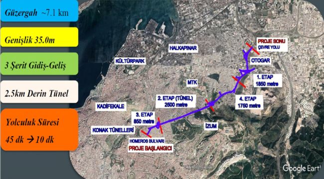 Tünel önümüzdeki aylarda hizmete alınacak viyadüklerle Konak’tan şehirlerarası otobüs terminaline ulaşımı kolaylaştıracak. Şehir içi trafiğe de nefes aldıracak projenin toplam uzunluğu 7,1 kilometreyi bulacak. Tünel tamamlandığında İzmir’in en uzun karayolu tüneli unvanına sahip olacak. İzmirlilerin halen kullanmakta olduğu Bayraklı 1 Tüneli 320 metre, Konak Tüneli bin 674 metre, Bayraklı 2 Tüneli ise bin 865 metre uzunluğunda. Viyadük inşaatı, bağlantı yolları, tünel inşaatı ve diğer etaplar ile birlikte yatırım miktarı 1 milyar liranın üzerinde olacak.
